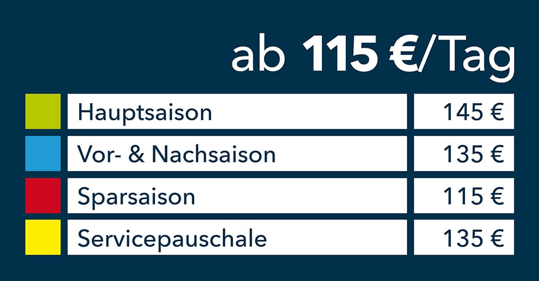 Gesamtpreis zzgl. einmaliger 135,- € Servicepauschale und 1000,- € Kaution.